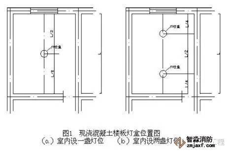 ⑴在配管前應按設計圖紙確定好配電設備、各種箱、盒及用電設備位置。在樓板內配管時,在土建摸板支設完畢后,根據(jù)設計圖紙在摸板上用紅油漆標注燈具、插座、探測器、接線盒、配電箱的位置。當室內只有一盞燈時,其燈位盒應設在縱橫墻(或梁)凈尺寸中心線的交叉處;有兩盞燈時,燈位盒應設在短軸線墻(或梁)凈尺寸中心線與長軸線墻(或梁)凈尺寸1/4 的交叉處,如圖1 所示。公共建筑走廊照明燈具,應按其頂部建筑結構不同,來合理地布置燈位盒的位置,當走廊頂部無凸出樓板下部的梁時,除考慮好樓梯對應處的燈位盒外,其他燈位盒宜沿走廊中心線均勻分布,如走廊頂部有凸出樓板下部的梁,確定燈位時,應考慮到燈位與梁的位置關系,燈位盒與梁之間的距離應協(xié)調,均勻一致,力求實用美觀。
