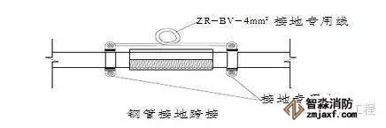 4.鋼管絲扣連接時在管接頭的兩端裝設專用接地跨接線,如圖。