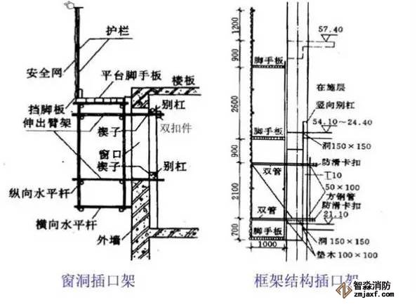 2、利用型鋼擱置在樓層內(nèi)作為底座(樓面擱置長(zhǎng)度大于1.5米,樓層內(nèi)預(yù)埋2道圓鋼錨固型鋼)搭設(shè)鋼管腳手架,同時(shí)用剛纜斜拉,高度不超過24米或8層。(個(gè)人認(rèn)為也有浪費(fèi)嫌疑,完全可以通過計(jì)算定下型鋼和圓鋼規(guī)格,不考慮斜拉。不過安全系數(shù)高,可以考慮)