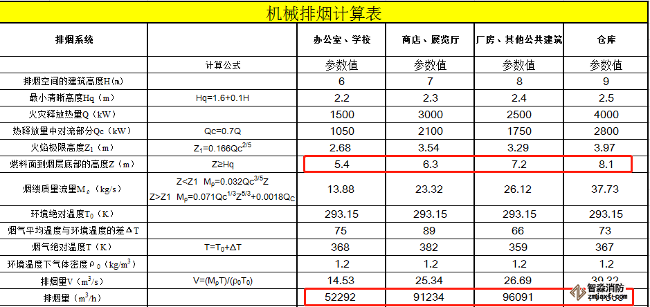 通過反算可知,表4.6.3中的排煙量數(shù)據(jù),應(yīng)該是按儲煙倉高度為10%房間凈高時的結(jié)果(以下為有噴淋情況的反算推算表),儲煙倉高度為房間凈高的10%,是規(guī)范要求的機(jī)械排煙最小儲煙倉厚度,也是燃料面到煙層底部高度(Z)的最大高度,由下表公式可知,相同條件下,煙層底部高度(Z)最大值時對應(yīng)的排煙量即最大排煙量,也就是說,表4.6.3所列的排煙量為最大排煙量,任何其他計算條件下的排煙量都不可能大于這個排煙量,再規(guī)定計算值不應(yīng)小于表4.6.3中的數(shù)值無意義