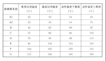 注:表中A1、A2、B、C、D、E、F、G為點型感溫探測器的不同類別,其具體參數(shù)應(yīng)符合附錄一的規(guī)定。