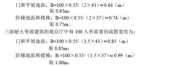 計(jì)算出一、二級耐火等級建筑觀眾廳中每100人所需要的疏散寬度分別為: