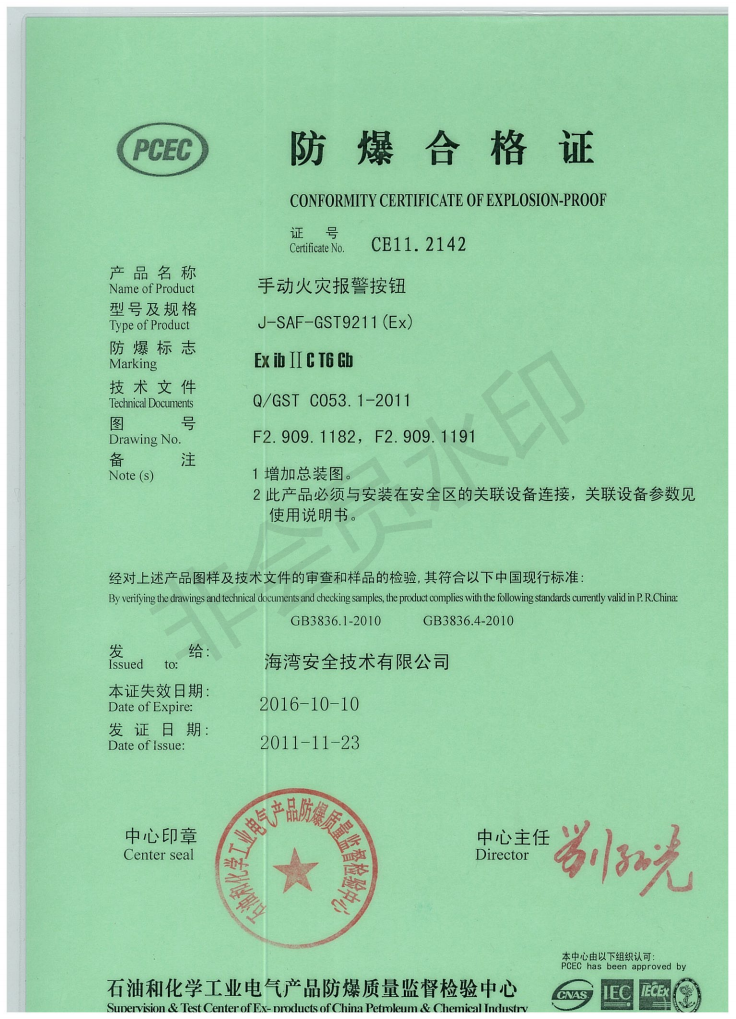 合格證中,GST9211-Ex的防爆標(biāo)志為:Ex d ib II C T6 Gb,按照?qǐng)D中紅色序號(hào)順序,所代表的含義分別為:①防爆標(biāo)志;②防爆形式;③設(shè)備類別;④氣體級(jí)別;⑤設(shè)備最高表面溫度級(jí)別;⑥設(shè)備保護(hù)級(jí)別。