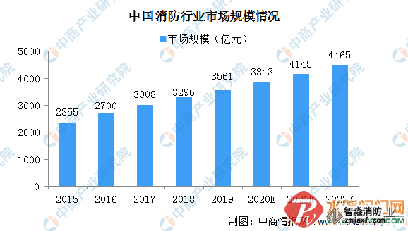 消防安全意識逐步提高,消防逐漸成為主動需求。城鎮(zhèn)化水平和交通運輸等配套投資不斷提高,持續(xù)帶動消防需求隨著我國城鎮(zhèn)化水平的不斷提升,消防行業(yè)的發(fā)展也迎來重要契機。近幾年,消防行業(yè)規(guī)模迅速擴大。2015年消防行業(yè)市場規(guī)模2355億元,2019年市場規(guī)模突破3500億元,預計2022年市場規(guī)模將達到4465億元。