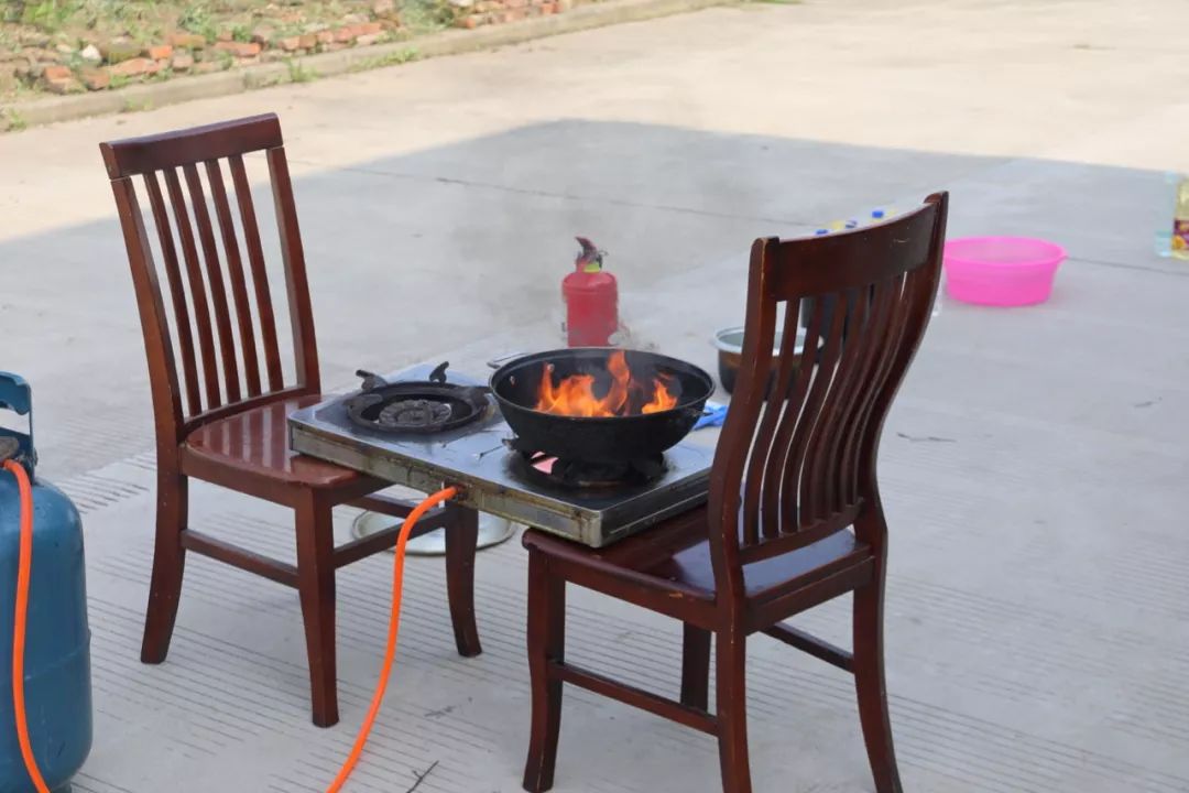 首先,消防員將食用油倒入鍋內(nèi)進(jìn)行加熱,充分加熱后點(diǎn)燃。