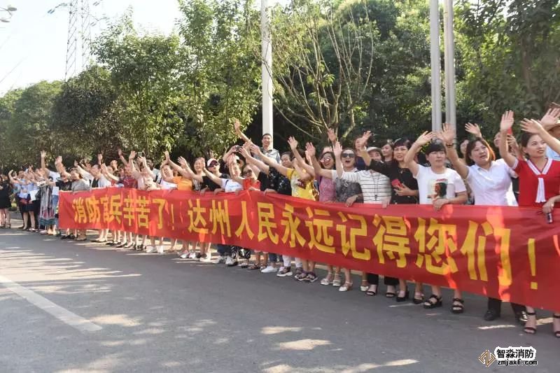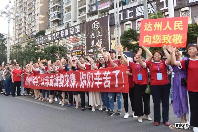火災(zāi)成功撲救后,在撤離現(xiàn)場,達州市民自發(fā)到街道兩側(cè),拉起“消防官兵,你們辛苦了!”“感激有你們”等大大小小的橫幅,向消防官兵致敬和送行。