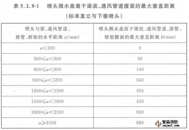 5.2.8 當(dāng)噴頭濺水盤高于附近梁底或高于寬度小于1.2m的通風(fēng)管道、排管、橋架腹面時,噴頭濺水盤高于梁底、通風(fēng)管道、排管、橋架腹面的最大垂直距離應(yīng)符合表5.2.8-1~表5.2.8-9的規(guī)定(見圖5.2.8)。