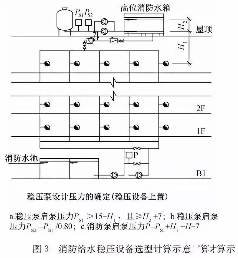 臨時(shí)高壓消防給水系統(tǒng)一般均應(yīng)設(shè)置高位消防水箱(除符合規(guī)范規(guī)定可不設(shè)的情形外),且對(duì)其設(shè)置高度有一定要求。日本規(guī)范規(guī)定自動(dòng)噴水滅火系統(tǒng)屋頂消防水箱最不利的最低供水壓力為0.15 MPa,美國(guó)、英國(guó)規(guī)范則要求0.10 MPa。我國(guó)1987年版和2006年版“建規(guī)”對(duì)比均沒有規(guī)定,只在條文中要求重力自流的消防水箱應(yīng)設(shè)置在建筑的最高部位。1982年版《高層民用建筑設(shè)計(jì)規(guī)范》(以下簡(jiǎn)稱“高規(guī)”)首次提出屋頂消防水箱應(yīng)滿足最不利消火栓的靜水壓力,但沒有提出設(shè)計(jì)參數(shù),1995年版“高規(guī)”做了具體規(guī)定。國(guó)標(biāo)圖集98S205編制目的是為解決臨時(shí)高壓消防給水系統(tǒng)高位消防水箱設(shè)置高度滿足不了系統(tǒng)最不利點(diǎn)靜水壓力時(shí)應(yīng)設(shè)增壓設(shè)施的要求,其為消防專用的增壓穩(wěn)壓設(shè)備的主要功能只是火災(zāi)初期時(shí)、消防主泵啟動(dòng)前,確保具有足夠消防壓力的30 s儲(chǔ)水量進(jìn)行初期火災(zāi)撲救,直至消防主泵全負(fù)荷啟動(dòng)運(yùn)行。這里更多的還是強(qiáng)調(diào)增壓的概念,設(shè)備類似于氣壓供水,發(fā)揮主要作用的是氣壓水罐,穩(wěn)壓水泵的作用是在3 min內(nèi),補(bǔ)足氣壓水罐內(nèi)實(shí)際穩(wěn)壓水容積。利用氣壓水罐所設(shè)定的P1、P2、PS1和PS2運(yùn)行壓力來控制穩(wěn)壓泵運(yùn)行工況。P1為根據(jù)計(jì)算求得消火栓系統(tǒng)或自動(dòng)噴水滅火系統(tǒng)中最不利點(diǎn)所需的消防壓力作為氣壓水罐的充氣壓力。平時(shí)管道系統(tǒng)如有滲漏泄壓等情況,控制穩(wěn)壓水泵不斷補(bǔ)水穩(wěn)壓,在PS1、PS2(啟動(dòng)-停止)反復(fù)運(yùn)行,一旦有火情,管道系統(tǒng)大量缺水,造成PS1下降(PS1→P2),降至P2時(shí),立即啟動(dòng)消防主泵。