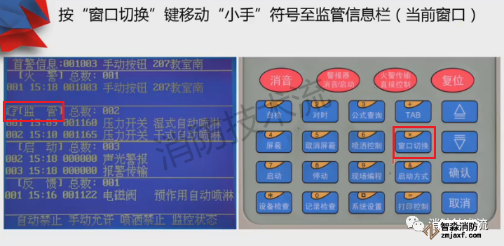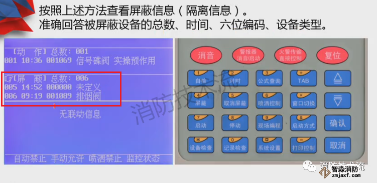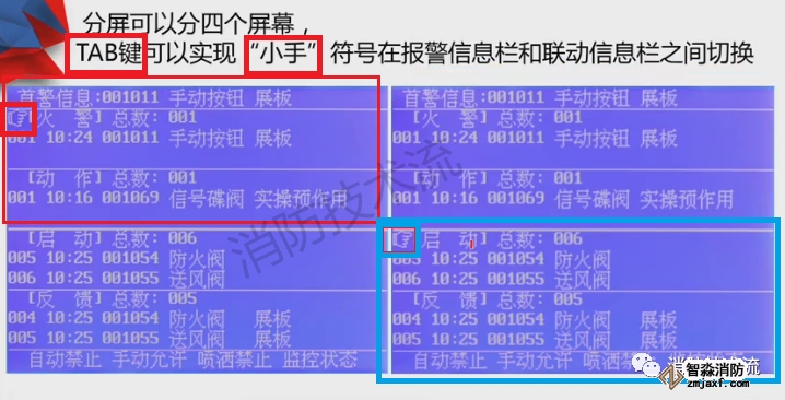 顯示屏分上、下半屏,上半屏為火警、監(jiān)管、故障、屏蔽等屬于報警信息,下半屏為啟動、反饋、動作等屬于聯(lián)動信息