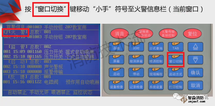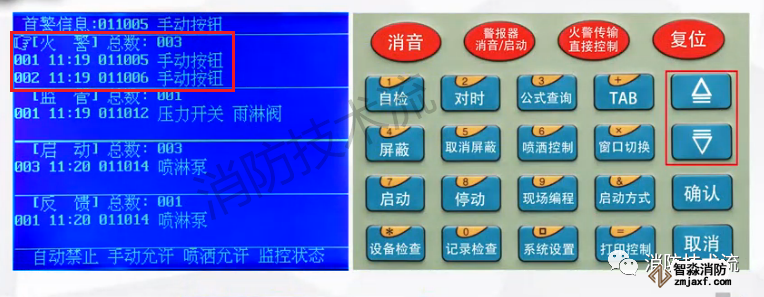 當某個類型信息總數(shù)超過2條時,可通過上下鍵翻動查看,例如火警信息總數(shù)是3,可通過按下翻鍵查看第三條火警信息