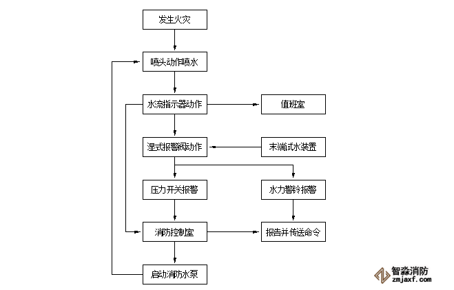 當發(fā)生火災(zāi)時,灑水噴頭的感溫元件自動脫落,并開始向保護區(qū)灑水,由于系統(tǒng)內(nèi)的水由原來的相對靜止狀態(tài),變?yōu)榱鲃訝顟B(tài),水流指示器感應(yīng)并送出信號,造成濕式報警閥的上下部的水壓差,從而開啟閥片,使供水管路暢通。根據(jù)水流指示器和壓力開關(guān)的信號,控制器啟動消防水泵向管網(wǎng)加壓供水,達到持續(xù)自動噴水滅火的作用。其工作原理如下圖: