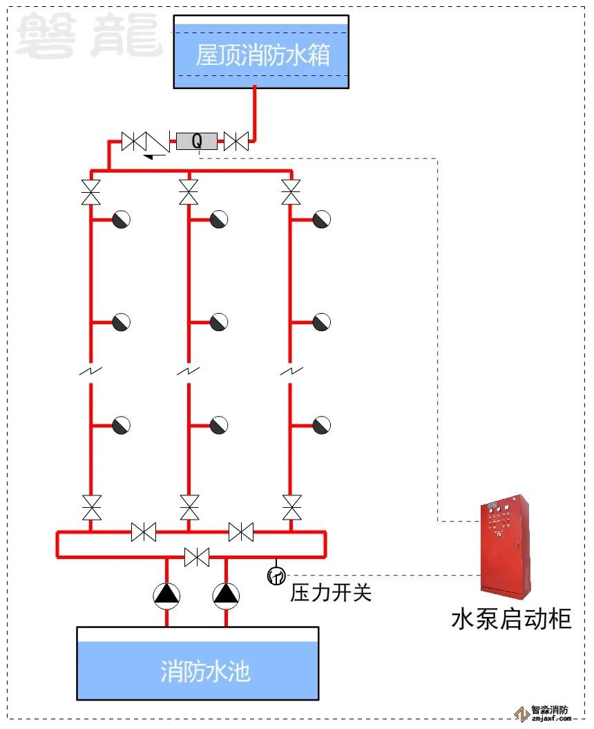 一、僅設(shè)置高位消防水箱,無(wú)穩(wěn)壓裝置的自動(dòng)噴水滅火系統(tǒng):