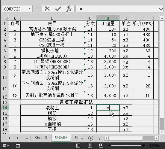大家在統(tǒng)計(jì)工程量的各項(xiàng)技術(shù)指標(biāo)時(shí),往往先需要匯總各項(xiàng)工程量(如混凝土的總和),該項(xiàng)工作特別麻煩,還容易出錯(cuò),有什么方法可以一步到位呢?常用函數(shù)Sumif可以幫大家解決這個(gè)問題。案例如下: