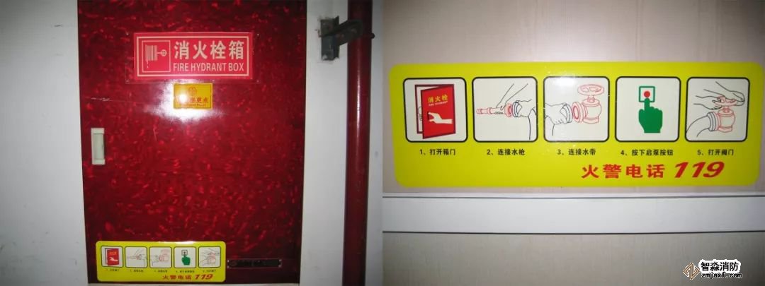 設(shè)置要求:在消火栓箱門中上部應(yīng)設(shè)置自發(fā)光式“消火栓箱”標(biāo)牌,在中下部張貼操作方法圖例,圖例大小420×140mm。