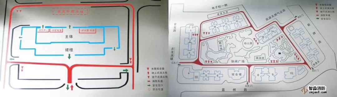 設(shè)置要求:在建筑大門口左側(cè)或住宅小區(qū)(廠區(qū)、庫區(qū))主入口處的醒目位置應(yīng)設(shè)置XX建筑消防總平面布局圖。主要包括建筑(住宅小區(qū)、廠區(qū)、庫區(qū)等)總平面布局圖、消防車道、撲救面、室外消火栓、水泵結(jié)合器、消防控制室位置、建筑通向室外的主要出口、以及住宅小區(qū)(廠區(qū)、庫區(qū)等)通向外部的出入口等內(nèi)容。
