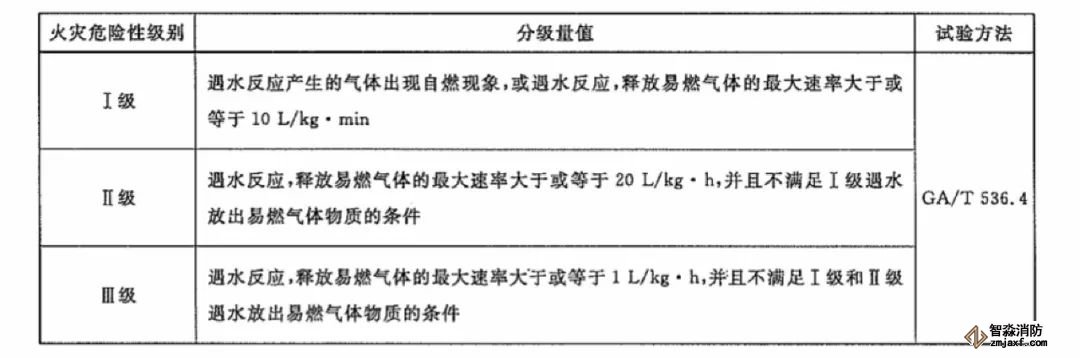 遇水放出易燃?xì)怏w物質(zhì)火災(zāi)危險(xiǎn)性分級(jí)方法見下表: