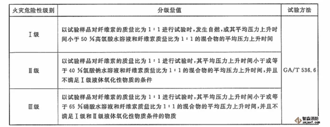 固體氧化性物質(zhì)火災(zāi)危險(xiǎn)性分級(jí)方法見下表: