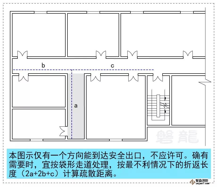 注:本圖示僅有一個方向能到達(dá)安全出口,不應(yīng)許可。確有需要時,宜按袋形走道處理,按最不利情況下的折返長度(2a+2b+c)計(jì)算疏散距離。比如,一二耐火等級的高層教學(xué)建筑:(2a+2b+c)≤15m。