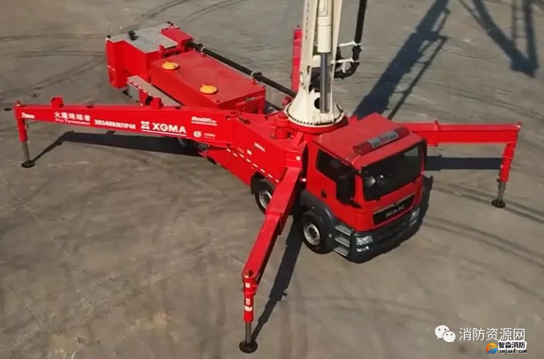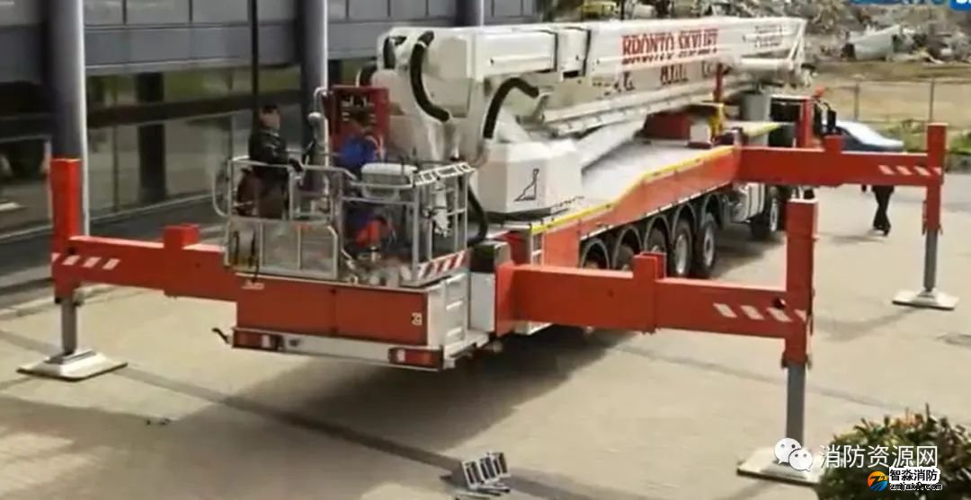 舉高車工作時(shí),通過(guò)支腿支撐,支腿通過(guò)支承墊板作用在登高場(chǎng)地上,消防車輪胎并不受力(懸空)。