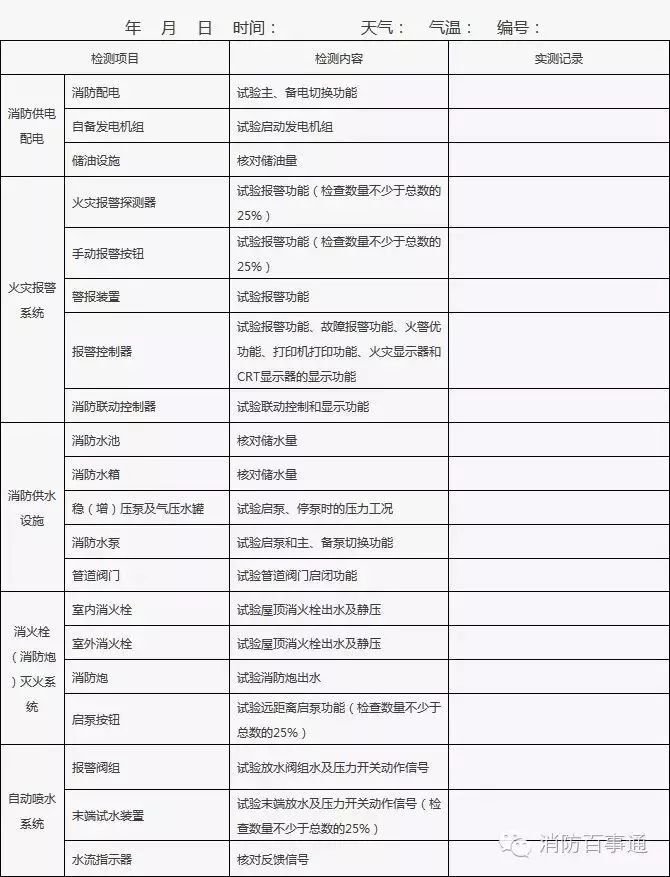 3、發(fā)現(xiàn)的問題或存在故障在“實(shí)測記錄”欄中填寫,并及時(shí)處置;當(dāng)場不能處置的要填報(bào)《建筑消防設(shè)施故障處理記錄》。