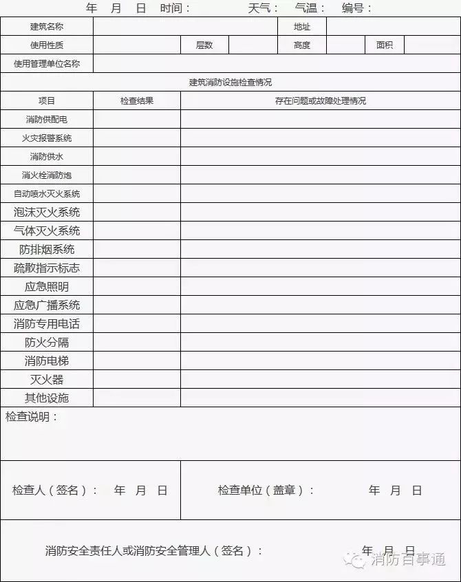 2、檢查發(fā)現(xiàn)建筑消防設(shè)施存在問題和故障的,實(shí)施檢查的人員必須向單位消防安全管理人報(bào)告,并填表。