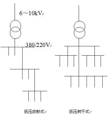 低壓配電系統(tǒng)的接線方式有三種,分別是放射式、樹(shù)干式和混合式。