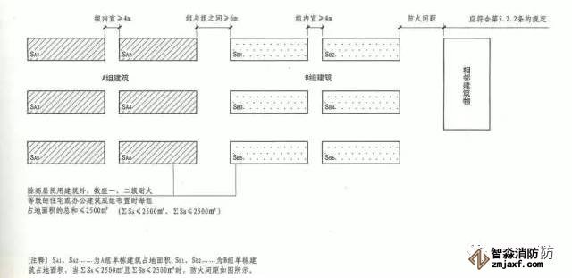 除高層民用建筑外,數(shù)座一、二級(jí)耐火等級(jí)的住宅建筑或辦公建筑,當(dāng)建筑物的占地面積總和不大于2500㎡時(shí),可成組布置,但組內(nèi)建筑物之間的間距不宜小于4m。組與組或組與相鄰建筑物的防火間距不應(yīng)小于本規(guī)范第5.2.2條的規(guī)定。