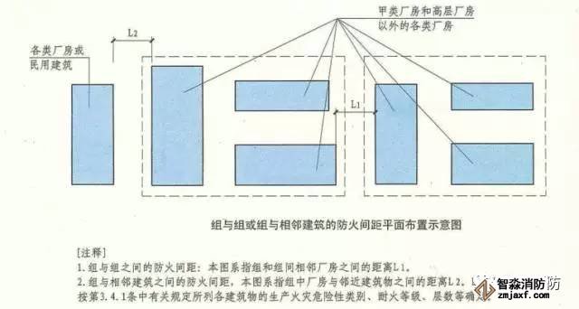 組與組或組與相鄰建筑的防火間距,應(yīng)根據(jù)相鄰兩座中耐火等級(jí)較低的建筑,按本規(guī)范第3.4.1條的規(guī)定確定。