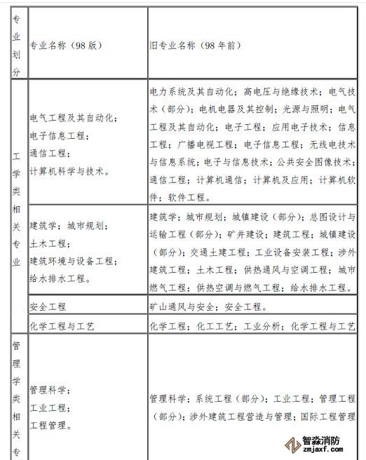 (一)取得消防工程專業(yè)大學(xué)??茖W(xué)歷,工作滿6年,其中從事消防安全技術(shù)工作滿4年;或者取得消防工程相關(guān)專業(yè)(見消防工程相關(guān)專業(yè)新舊對照表,下同)大學(xué)??茖W(xué)歷,工作滿7年,其中從事消防安全技術(shù)工作滿5年。