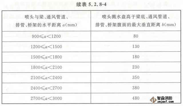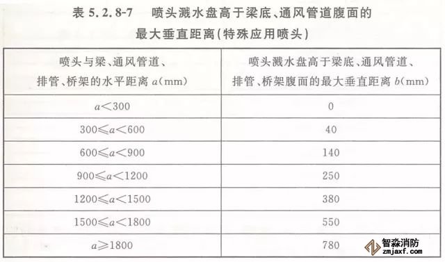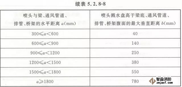 5.2.8 當(dāng)噴頭濺水盤高于附近梁底或高于寬度小于1.2m的通風(fēng)管道、排管、橋架腹面時,噴頭濺水盤高于梁底、通風(fēng)管道、排管、橋架腹面的最大垂直距離應(yīng)符合表5.2.8-1~表5.2.8-9的規(guī)定(見圖5.2.8)。