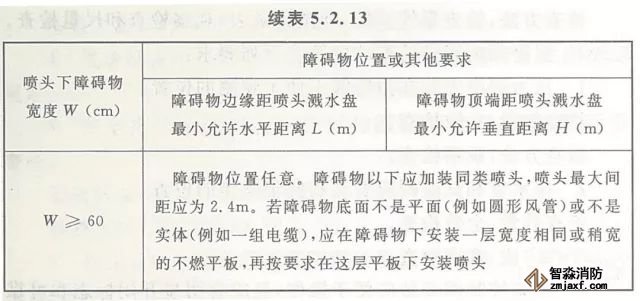 5.2.13 早期抑制快速響應(yīng)(ESFR)噴頭與噴頭下障礙物的距離應(yīng)滿足本規(guī)范圖5.2.12所示的要求。當(dāng)無法滿足要求時,噴頭下障礙物的寬度與位置應(yīng)滿足本規(guī)范表5.2.13的規(guī)定。