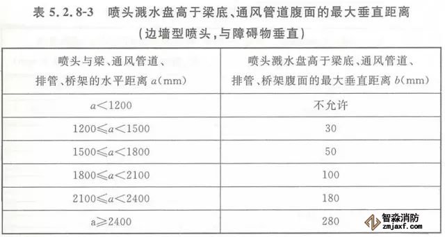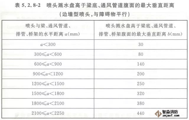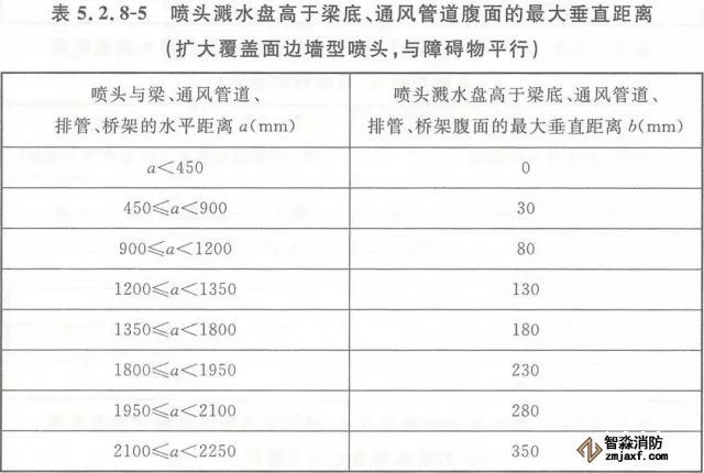 5.2.8 當(dāng)噴頭濺水盤(pán)高于附近梁底或高于寬度小于1.2m的通風(fēng)管道、排管、橋架腹面時(shí),噴頭濺水盤(pán)高于梁底、通風(fēng)管道、排管、橋架腹面的最大垂直距離應(yīng)符合表5.2.8-1~表5.2.8-9的規(guī)定(見(jiàn)圖5.2.8)。