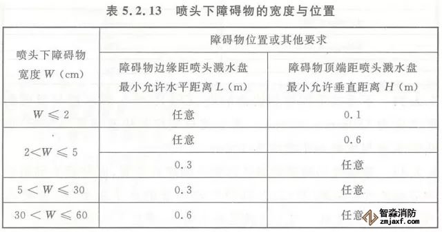 5.2.13 早期抑制快速響應(yīng)(ESFR)噴頭與噴頭下障礙物的距離應(yīng)滿(mǎn)足本規(guī)范圖5.2.12所示的要求。當(dāng)無(wú)法滿(mǎn)足要求時(shí),噴頭下障礙物的寬度與位置應(yīng)滿(mǎn)足本規(guī)范表5.2.13的規(guī)定。