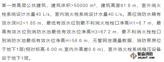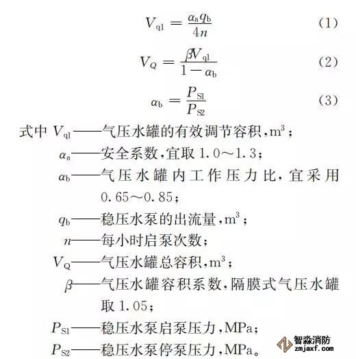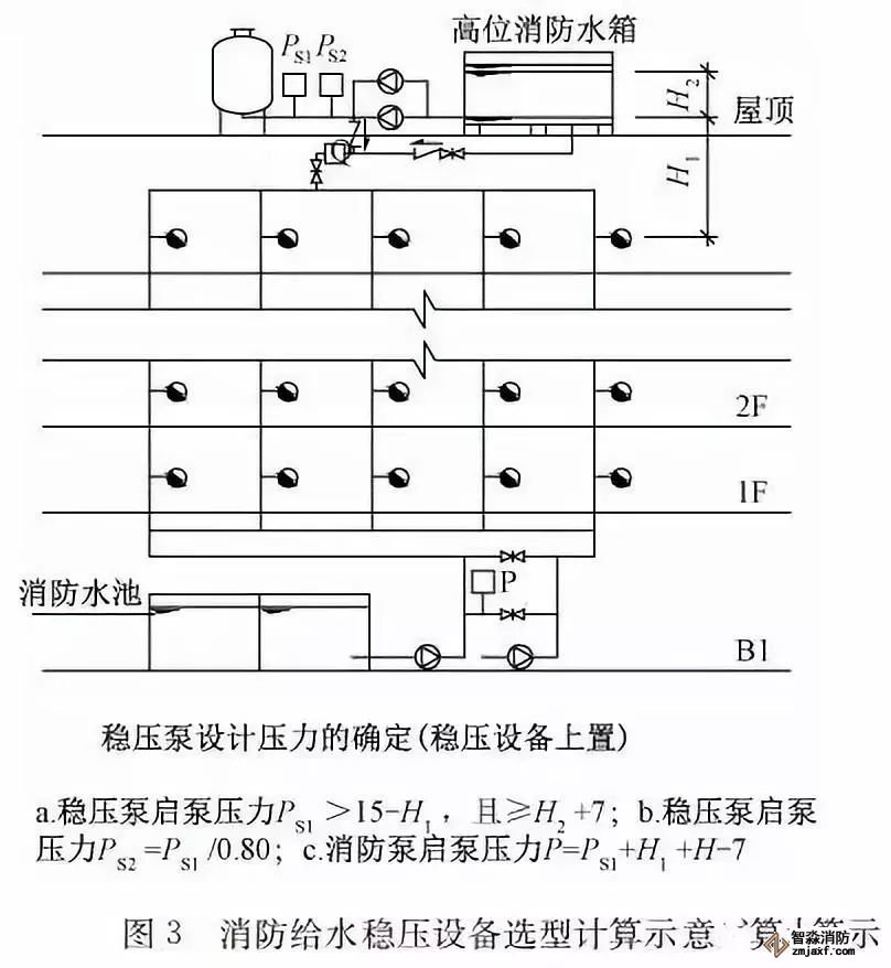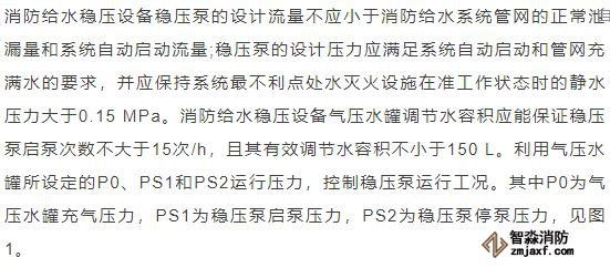 臨時(shí)高壓消防給水系統(tǒng)一般均應(yīng)設(shè)置高位消防水箱(除符合規(guī)范規(guī)定可不設(shè)的情形外),且對其設(shè)置高度有一定要求。日本規(guī)范規(guī)定自動(dòng)噴水滅火系統(tǒng)屋頂消防水箱最不利的最低供水壓力為0.15 MPa,美國、英國規(guī)范則要求0.10 MPa。我國1987年版和2006年版“建規(guī)”對比均沒有規(guī)定,只在條文中要求重力自流的消防水箱應(yīng)設(shè)置在建筑的最高部位。1982年版《高層民用建筑設(shè)計(jì)規(guī)范》(以下簡稱“高規(guī)”)首次提出屋頂消防水箱應(yīng)滿足最不利消火栓的靜水壓力,但沒有提出設(shè)計(jì)參數(shù),1995年版“高規(guī)”做了具體規(guī)定。國標(biāo)圖集98S205編制目的是為解決臨時(shí)高壓消防給水系統(tǒng)高位消防水箱設(shè)置高度滿足不了系統(tǒng)最不利點(diǎn)靜水壓力時(shí)應(yīng)設(shè)增壓設(shè)施的要求,其為消防專用的增壓穩(wěn)壓設(shè)備的主要功能只是火災(zāi)初期時(shí)、消防主泵啟動(dòng)前,確保具有足夠消防壓力的30 s儲水量進(jìn)行初期火災(zāi)撲救,直至消防主泵全負(fù)荷啟動(dòng)運(yùn)行。這里更多的還是強(qiáng)調(diào)增壓的概念,設(shè)備類似于氣壓供水,發(fā)揮主要作用的是氣壓水罐,穩(wěn)壓水泵的作用是在3 min內(nèi),補(bǔ)足氣壓水罐內(nèi)實(shí)際穩(wěn)壓水容積。利用氣壓水罐所設(shè)定的P1、P2、PS1和PS2運(yùn)行壓力來控制穩(wěn)壓泵運(yùn)行工況。P1為根據(jù)計(jì)算求得消火栓系統(tǒng)或自動(dòng)噴水滅火系統(tǒng)中最不利點(diǎn)所需的消防壓力作為氣壓水罐的充氣壓力。平時(shí)管道系統(tǒng)如有滲漏泄壓等情況,控制穩(wěn)壓水泵不斷補(bǔ)水穩(wěn)壓,在PS1、PS2(啟動(dòng)-停止)反復(fù)運(yùn)行,一旦有火情,管道系統(tǒng)大量缺水,造成PS1下降(PS1→P2),降至P2時(shí),立即啟動(dòng)消防主泵。