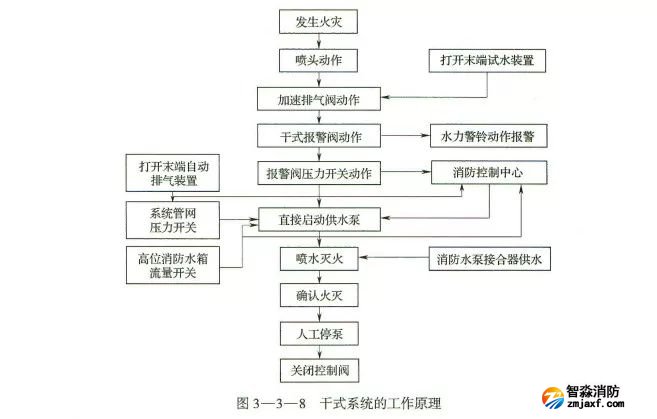 組成:閉式噴頭、管網、干式報警閥、充氣設備、報警裝置和供水設備。
