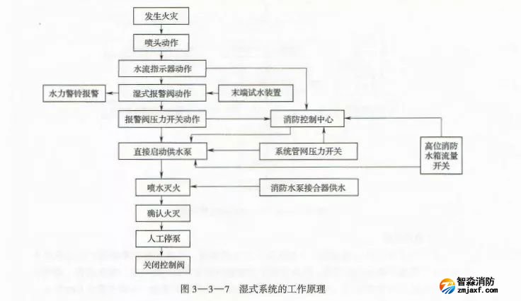 在壓力差的作用下,原來處于關閉狀態(tài)的濕式報警閥自動開啟。此時,壓力水通過濕式報警閥流向官網,同時打開通向水力警鈴的通道,延遲器充滿水后,水力警鈴發(fā)出聲響警報,高位消防水箱流量開關或系統(tǒng)官網的壓力開關動作并輸出信號直接啟動供水泵。供水泵投入運行后,完成系統(tǒng)的啟動過程。